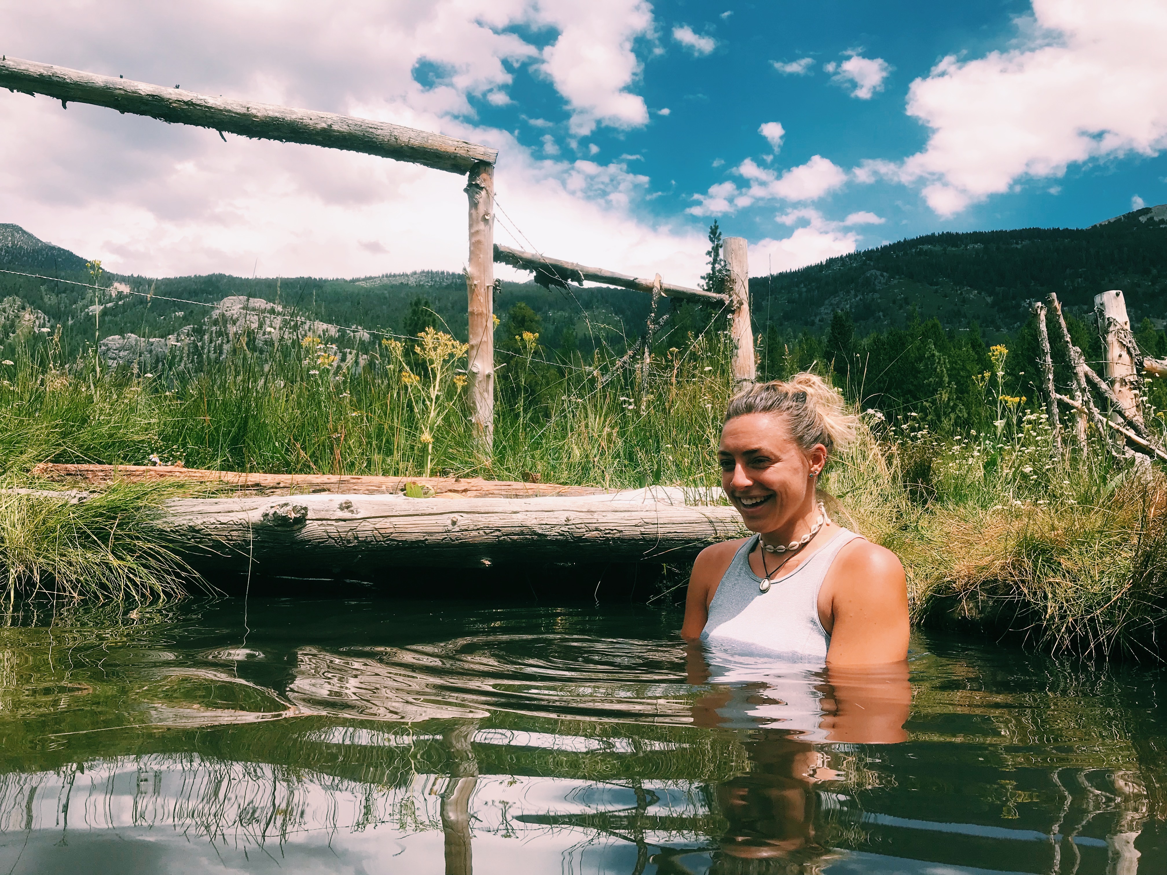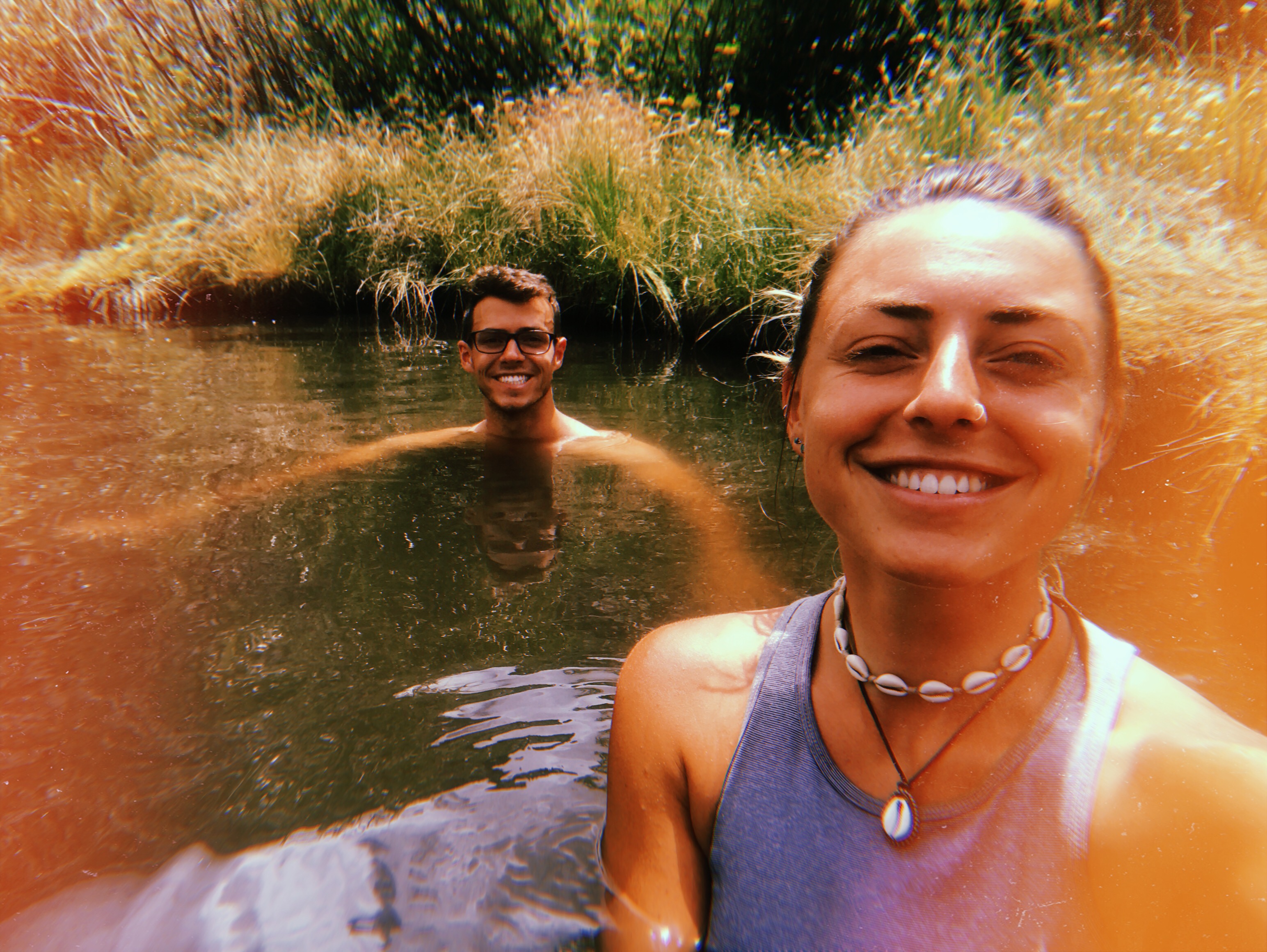 We come up to the first hot spring, it’s small so we look for more, we come across a second one and there is a man sitting in what looks to be mud. He claims the water here is 101 degrees and the other one is 104 degrees. Then there was a small lake just past the man that was warm like bath water. We took a dip there and in the brown hot spring. It was our first dark and cloudy day so far on our trip and the warm water felt nice.