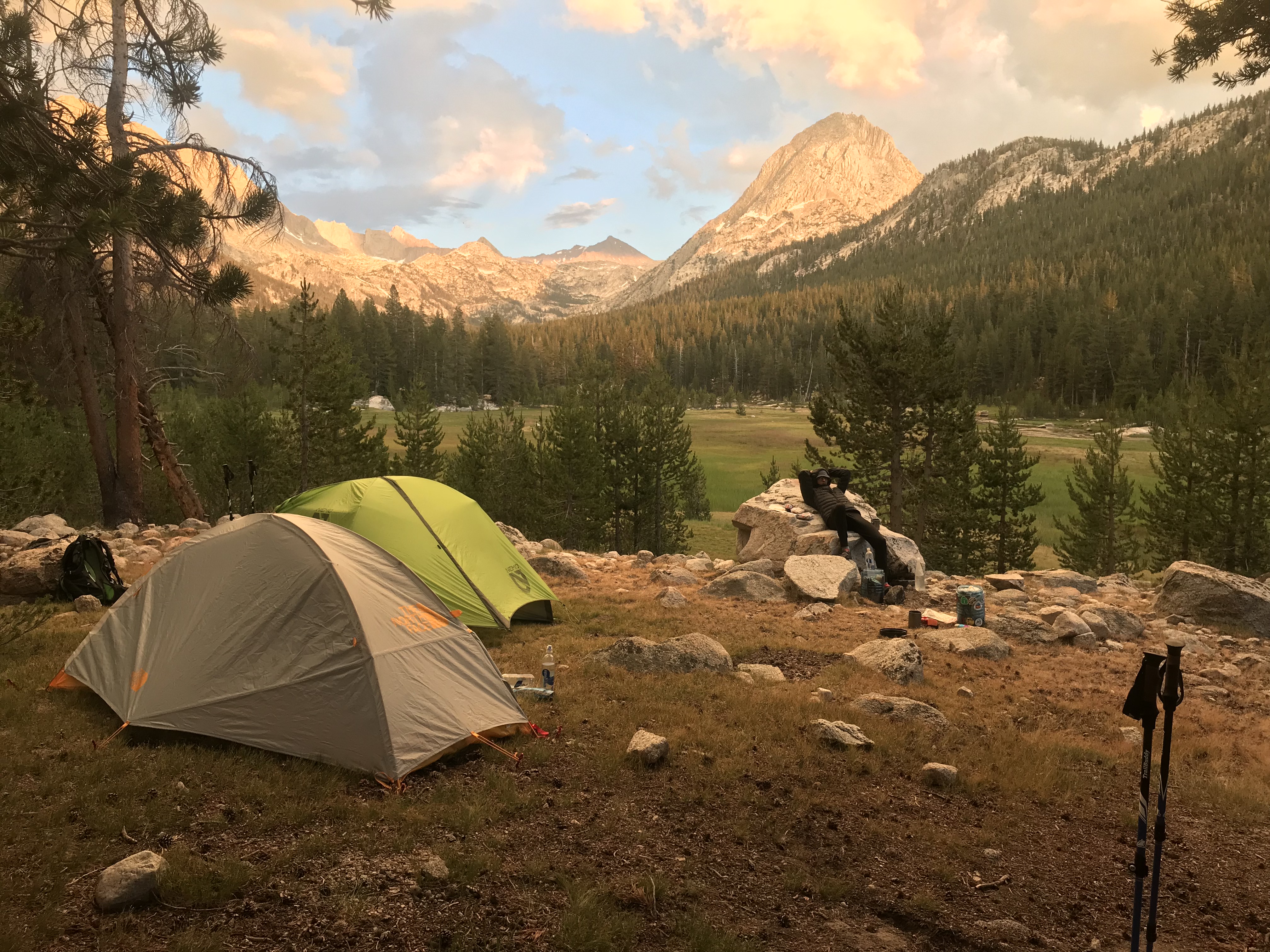 Our site for the night is gorgeous. Views of the mountains, leading to Muir Pass, and a beautiful meadow with a bubbling creek. The only downside here were of course the mosquitoes. Mosquitoes are by far the worst thing about the trip, Everything else I can handle, but the non-stop bussing in my ears and having to constantly defend my skin drives my nuts.