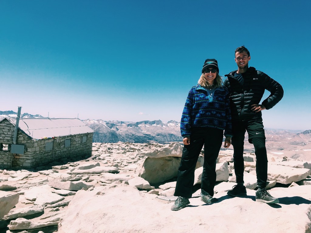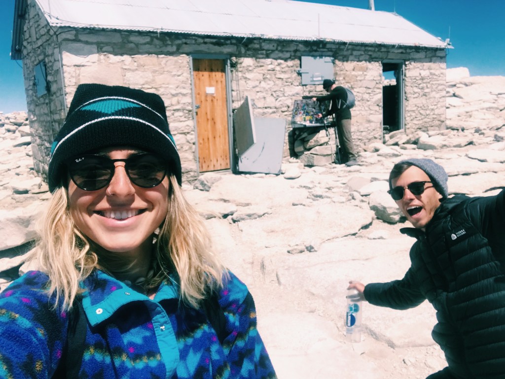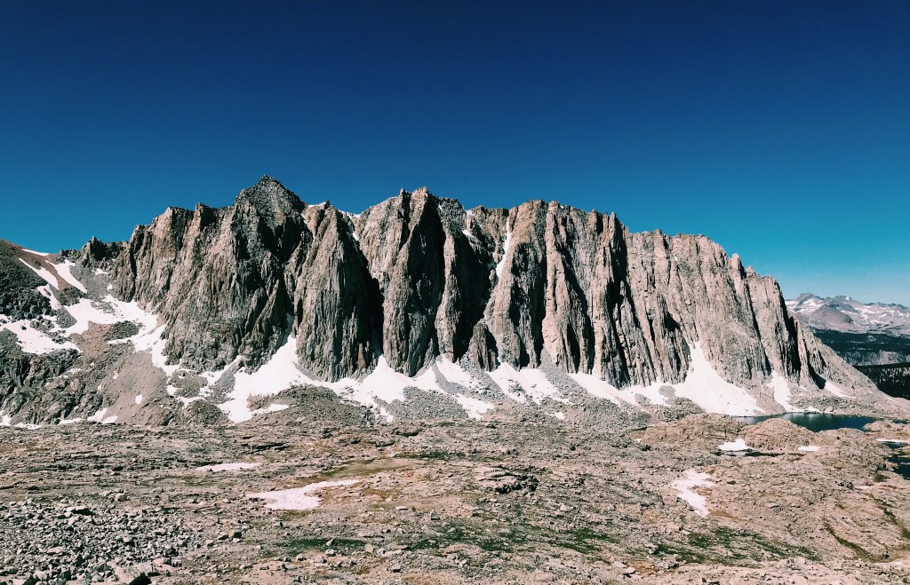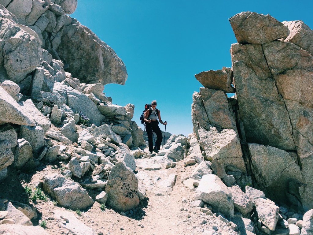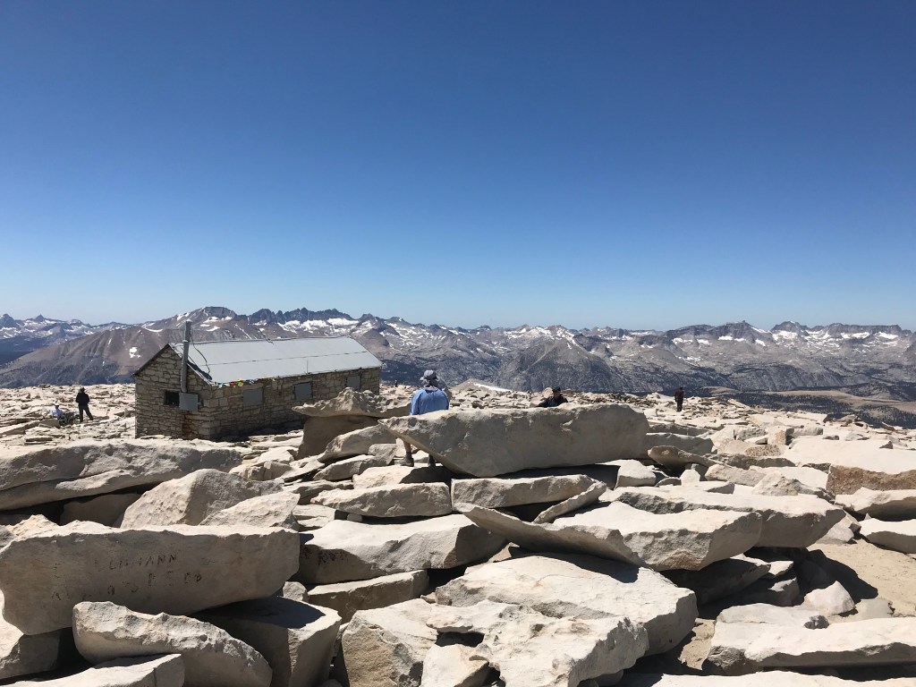 The junction that breaks off to the summit of Whitney or to the Whitney portal was full of tourists. We dropped our packs near the 20 other packs we saw, prepared our day pack (a bit of trail magic from day 1) with water and snacks, and secured our remaining food from the many marmots lurking around. From there it was a 1.9 mile climb to the top. This part of the hike was not so difficult, but it was scary. You’re walking on the edge of a jagged cliff, over rocks that are slanted and slick. I can only imagine how many careless people have slipped and fallen to their death. There was a small patch of snow before the top, but it was nothing compared to what we saw at Muir and Forester Passes.