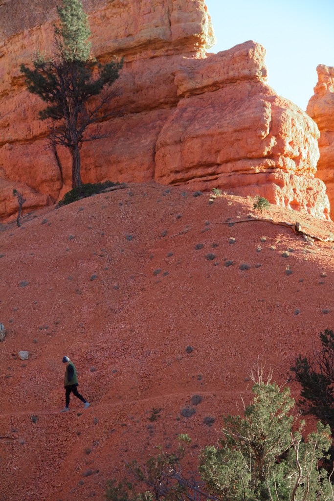 We hiked the Navajo Loop and Queens Garden trail (3mi) in the counterclockwise direction. To protect everyone’s knees we wanted to do the steepest section of trail (the switchbacks) downhill and get it out of the way at the beginning. The trail immediately descends and you’re among the colorful towers of hoodoos and pillars. One hoodoo named Thor’s Hammer stands out on your left, then come the switchbacks. If you’re into travel content you have probably seen photos of this section of the trail before, it is very photogenic, especially with the red rocks and the way the canyon holds the light. Once you reach the bottom, the trail starts a gentle incline all the way back up but first it takes you through a landscape similar to what I imagine mars to look like. We took our time soaking it all in, taking photos, and imagining what this place was like before it became a National Park.