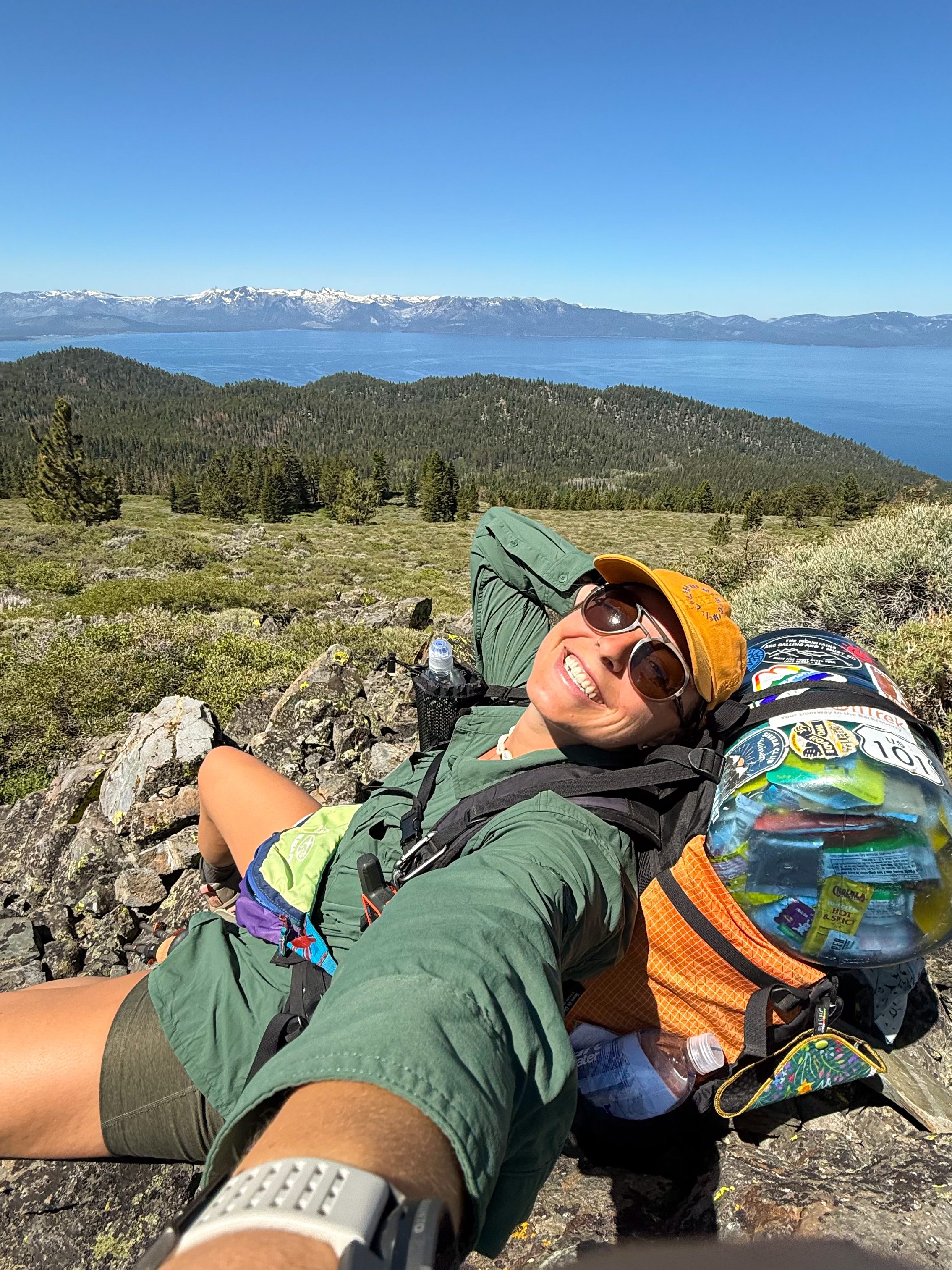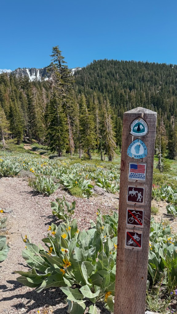 As the trail trended downward there were many gorgeous views of Lake Tahoe and the surrounding area with lots of gorgeous exposed trail weaving through wildflower meadows. I took a break at the last water source for the day before setting off to find my campsite for the night.