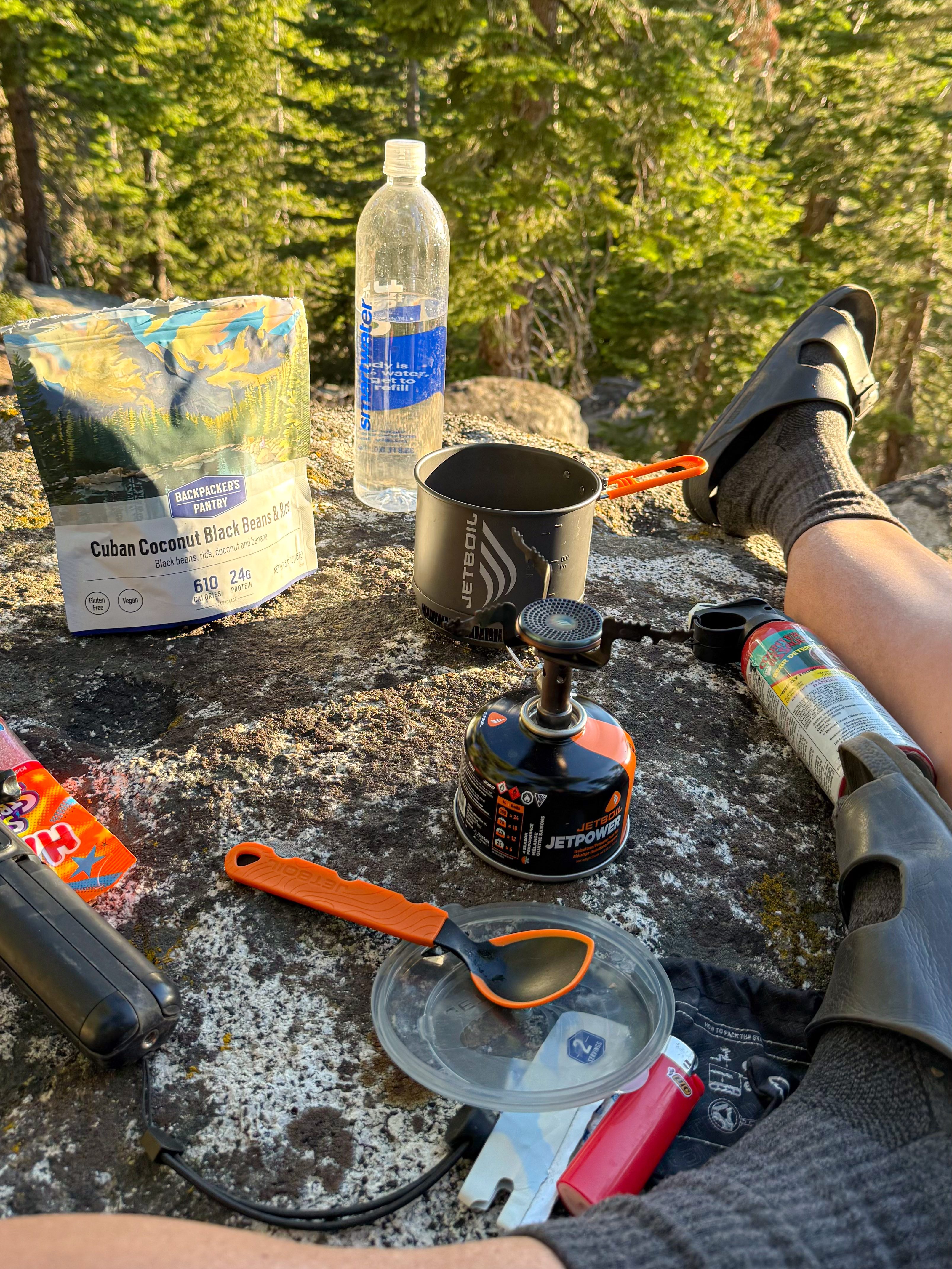 I found a snug spot for my tent among a pile of boulders with a great view of the lake through some trees. I stretched and laid in the sun for while before making dinner. Tonight, I would have the Cuban Black Beans and Rice from Backpackers Pantry. It has banana and coconut in it which I loved! I would definitely get this meal again.