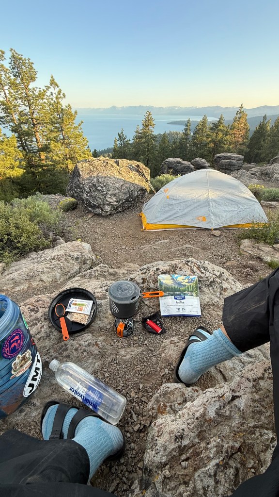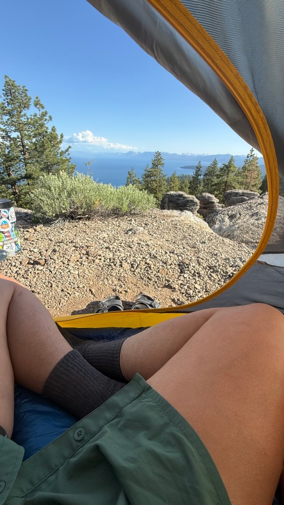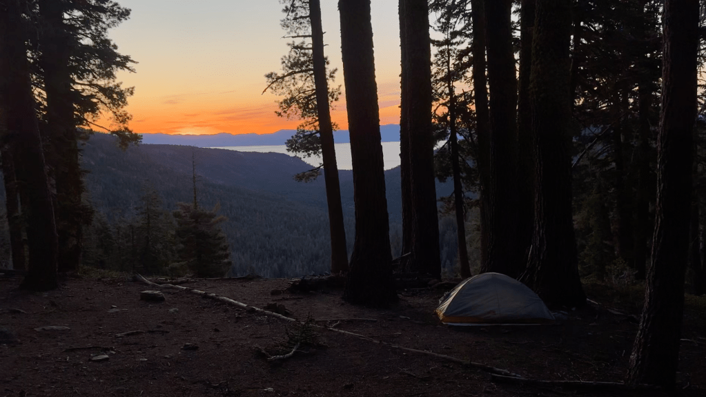 Just after the saddle junction the trail descended and on the way down, a campsite caught my eye. Even though I was hoping to get in a few more miles for the day, this campsite was just too good to pass up. It was perched near the edge of a basin with tree cover and a clear view of Lake Tahoe. This was one of my favorite campsites of the trip, and definitely was the best view!