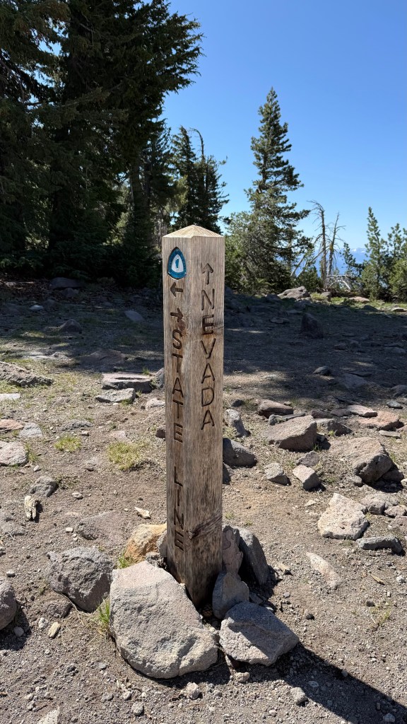 I packed up camp, then hit the trail eager to find the “reliable spring” about 8 miles ahead that would be my first water source of the day. I was also looking forward to crossing back over the California State Line into Nevada, and Relay Peak, the highest point on the Tahoe Rim Trail at about 10,300 ft elevation.
