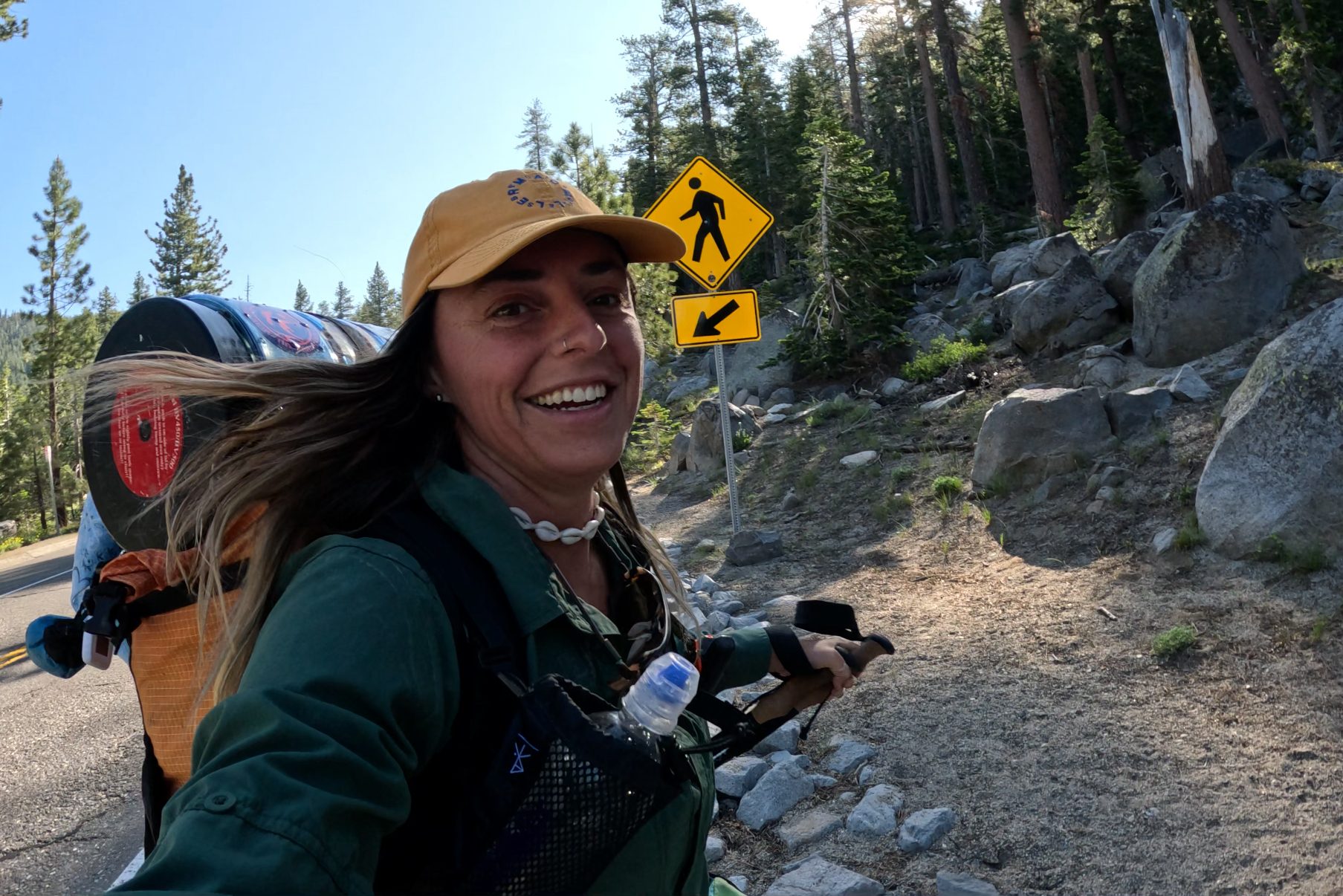 I would be coming up to the most dangerous and scary part of hiking the Tahoe Rim Trail, crossing highway 50 during rush hour on a Thursday evening. Cars zipped by in both directions on the 5- lane highway. I wondered how long it would take for there to be a long enough break in traffic to safely cross. I stood in the heat on the side of the road thirsty and tired, swiveling my head back and forth for half an hour. I shed a few tears of frustrating wondering if I would have to wait until dark for the traffic to calm down.